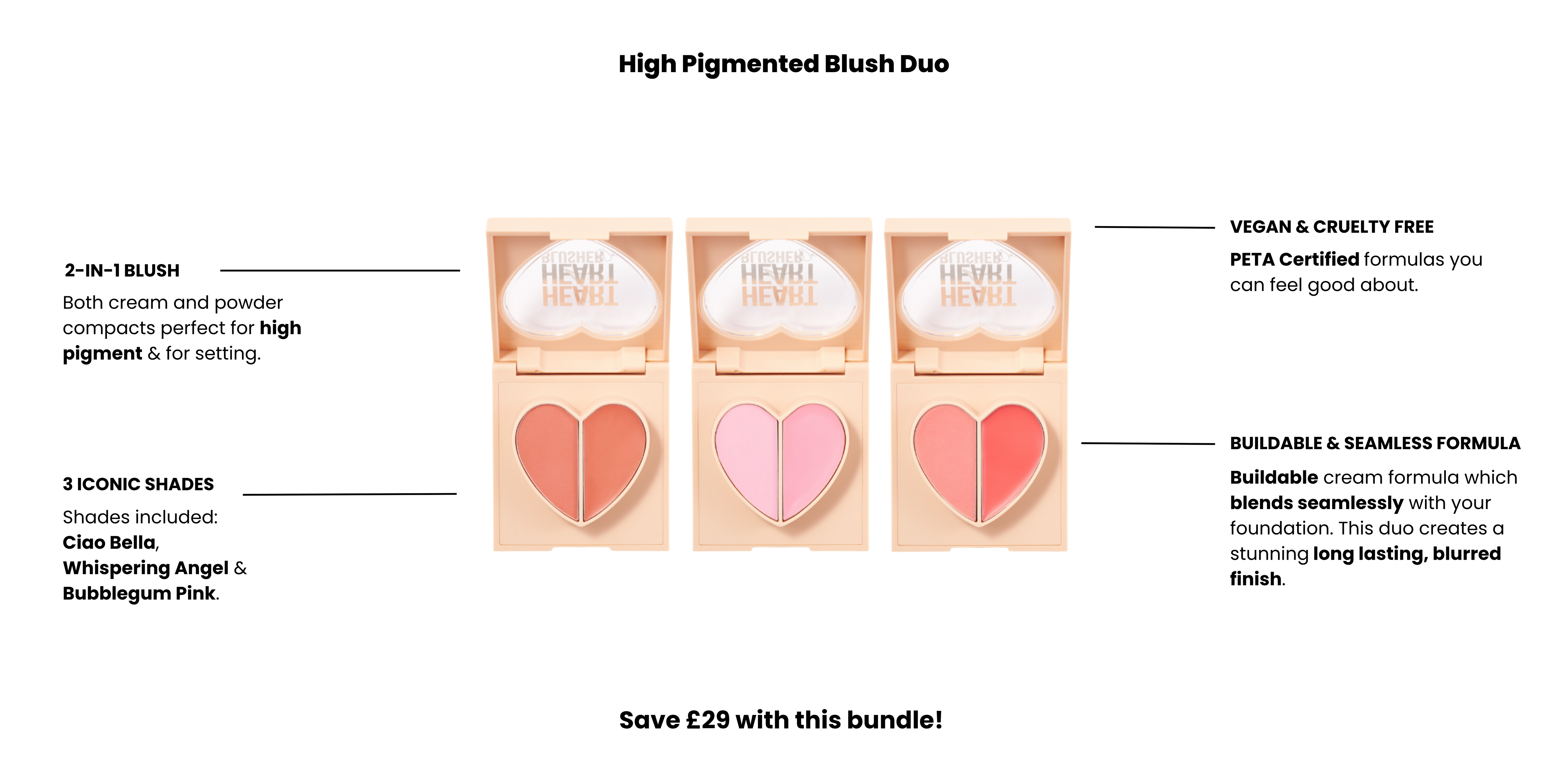 Add a pop of colour to your cheeks with our stunning heart 2 heart blush duos An iconic 2 in 1 blush featuring both cream and powder compacts. The cream formula is highly pigmented yet buildable and blends seamlessly with your foundation. Paired with the powder blush to set in place, this duo creates a stunning long lasting, blurred finish.