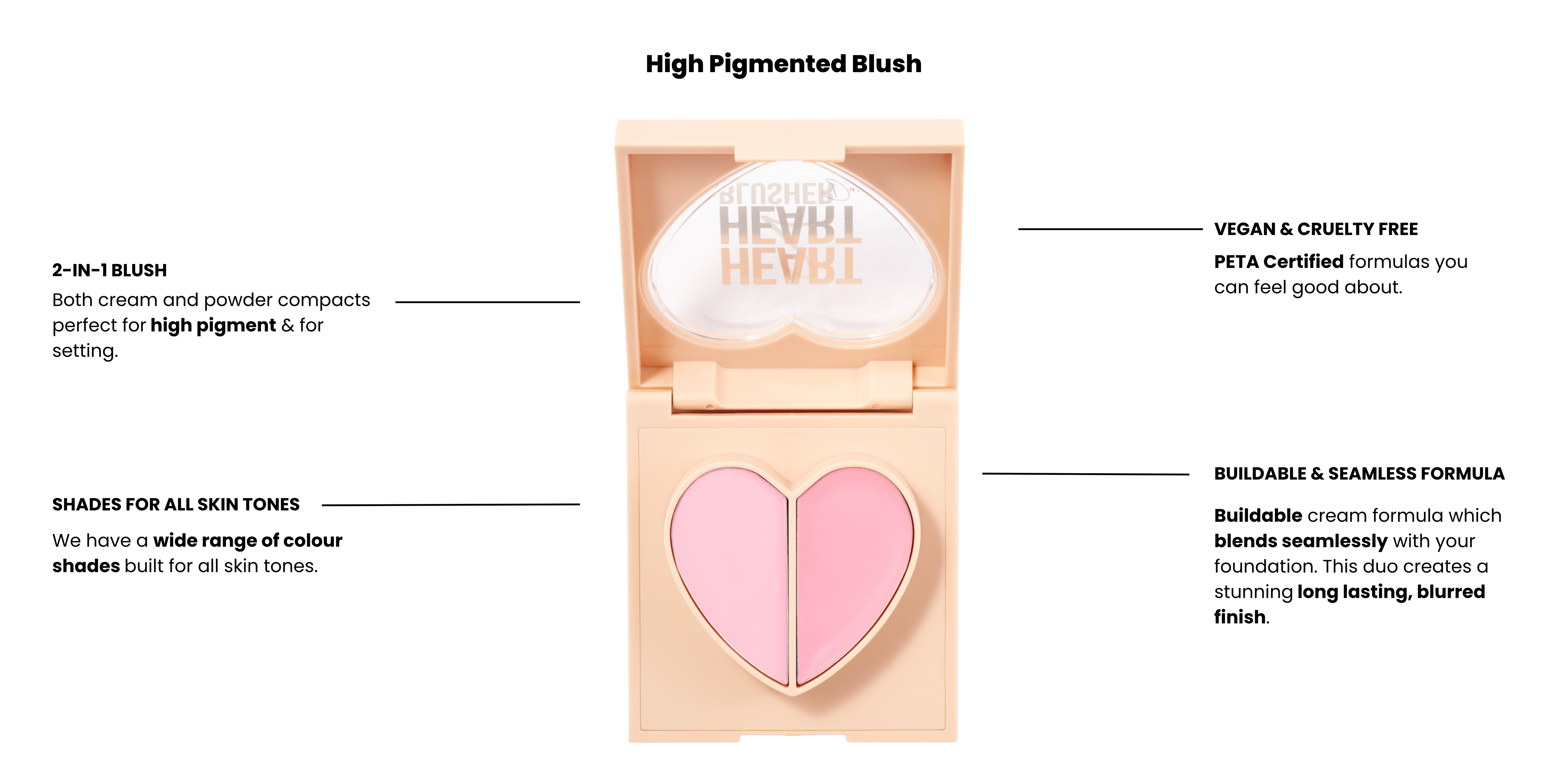 Add a pop of colour to your cheeks with our stunning heart 2 heart blush duos An iconic 2 in 1 blush featuring both cream and powder compacts. The cream formula is highly pigmented yet buildable and blends seamlessly with your foundation. Paired with the powder blush to set in place, this duo creates a stunning long lasting, blurred finish.