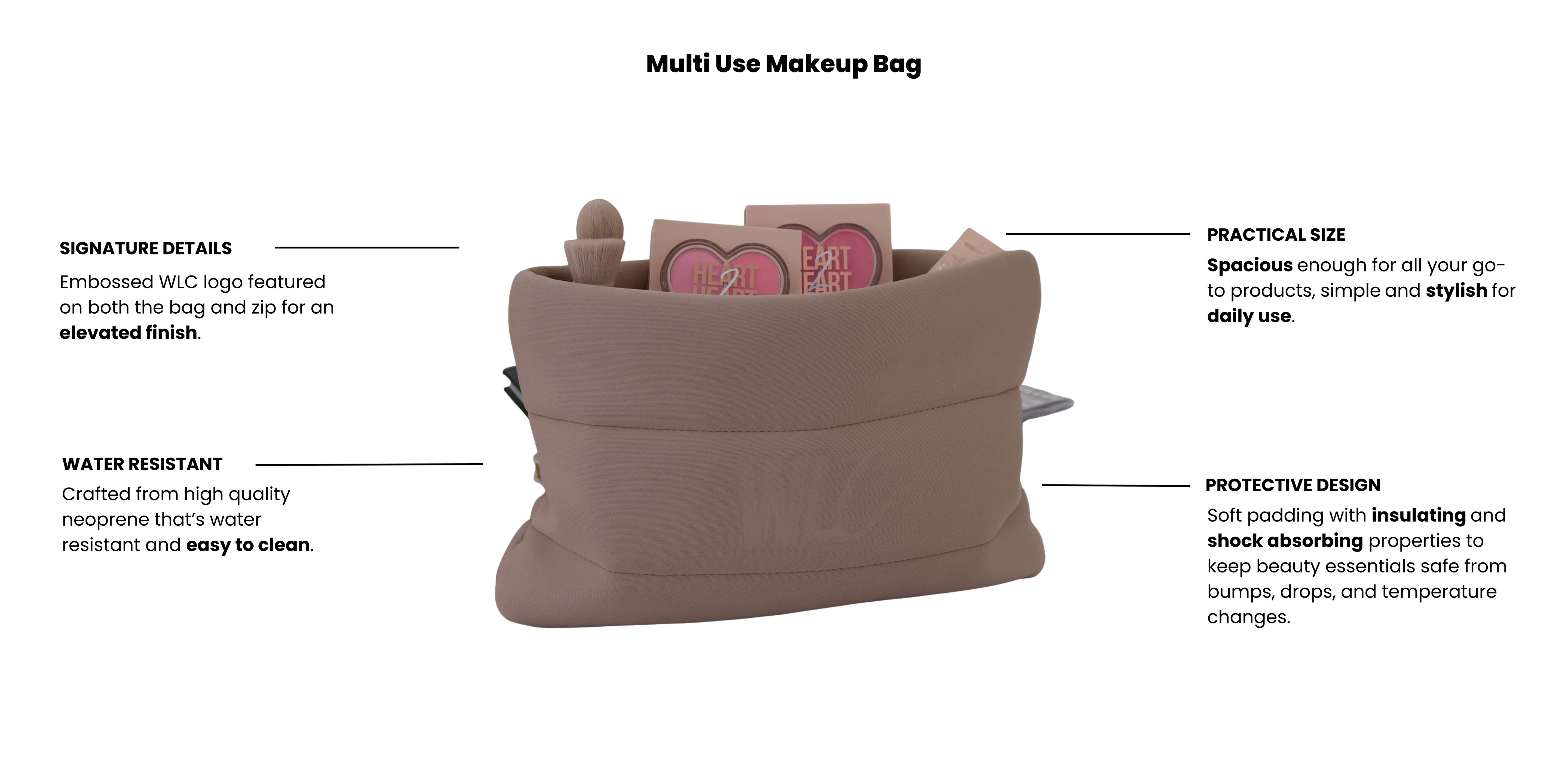 Crafted from premium neoprene, this makeup bag is water-resistant, easy to clean, and features a soft, padded design that cushions and protects your beauty essentials. Its insulating, shock-absorbing properties help regulate temperature and protect against bumps and drops.