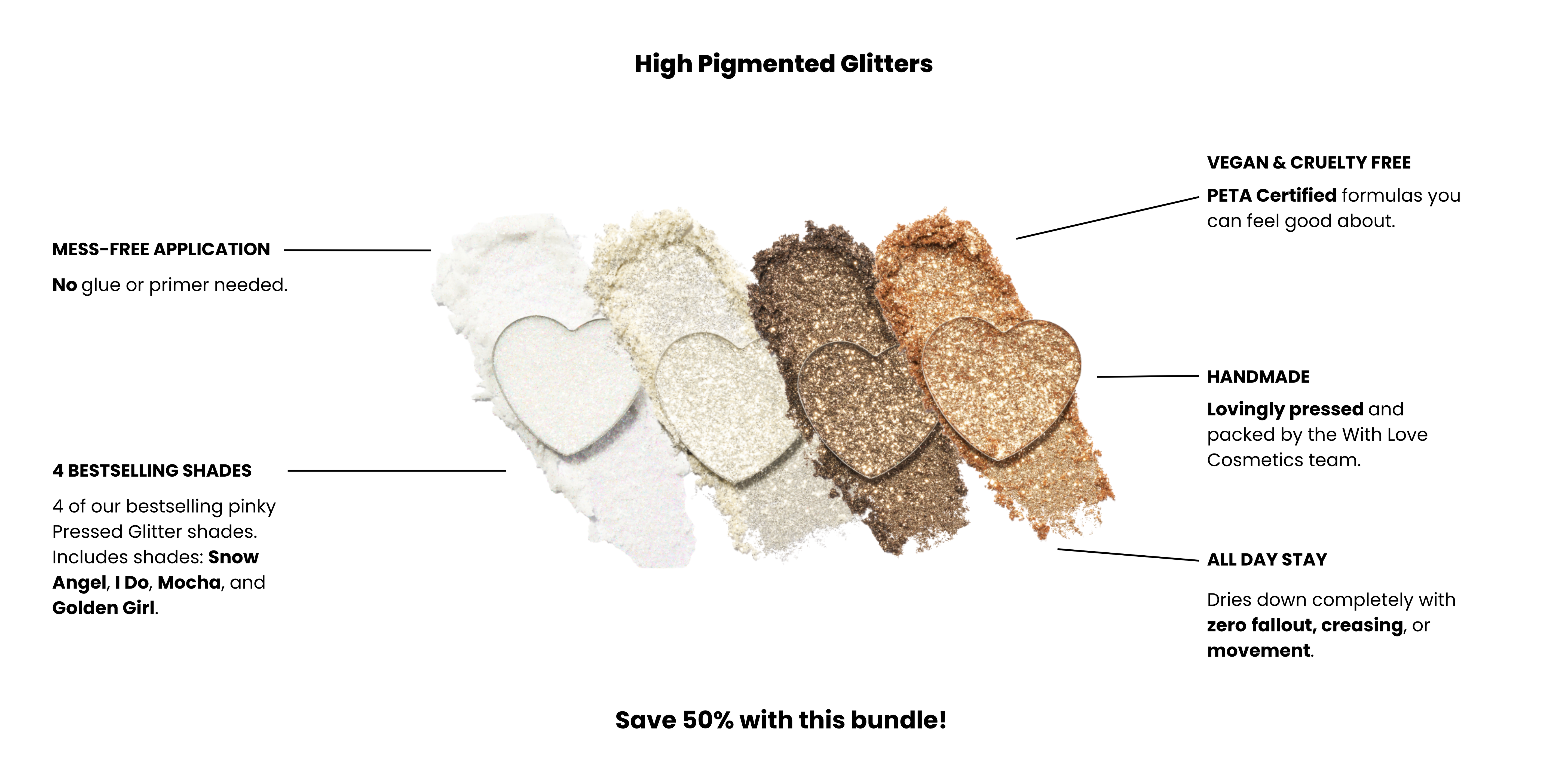 Neutral lovers, this one’s for you. Our Neutrals Bundle features 4 of our best-selling shades: Snow Angel, I Do, Mocha, and Golden Girl. Each pressed glitter is handmade by the With Love Cosmetics team using our unique formula for intense colour payoff, effortless application, and long-lasting sparkle.