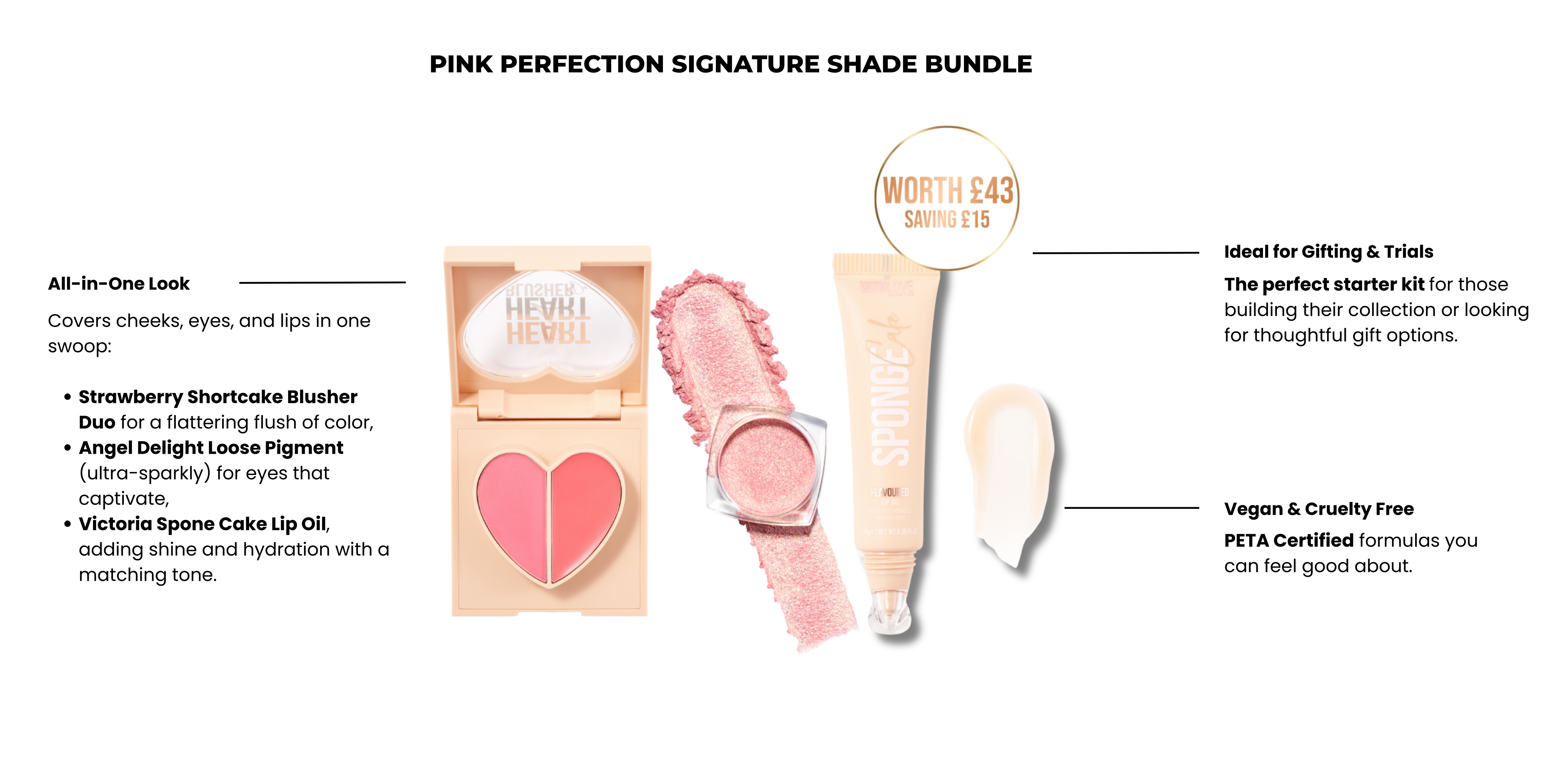 Pink Perfection Includes - strawberry shortcake Blusher Duo, Victoria Sponge Cake Lip Oil, Angel Delight Loose Pigment