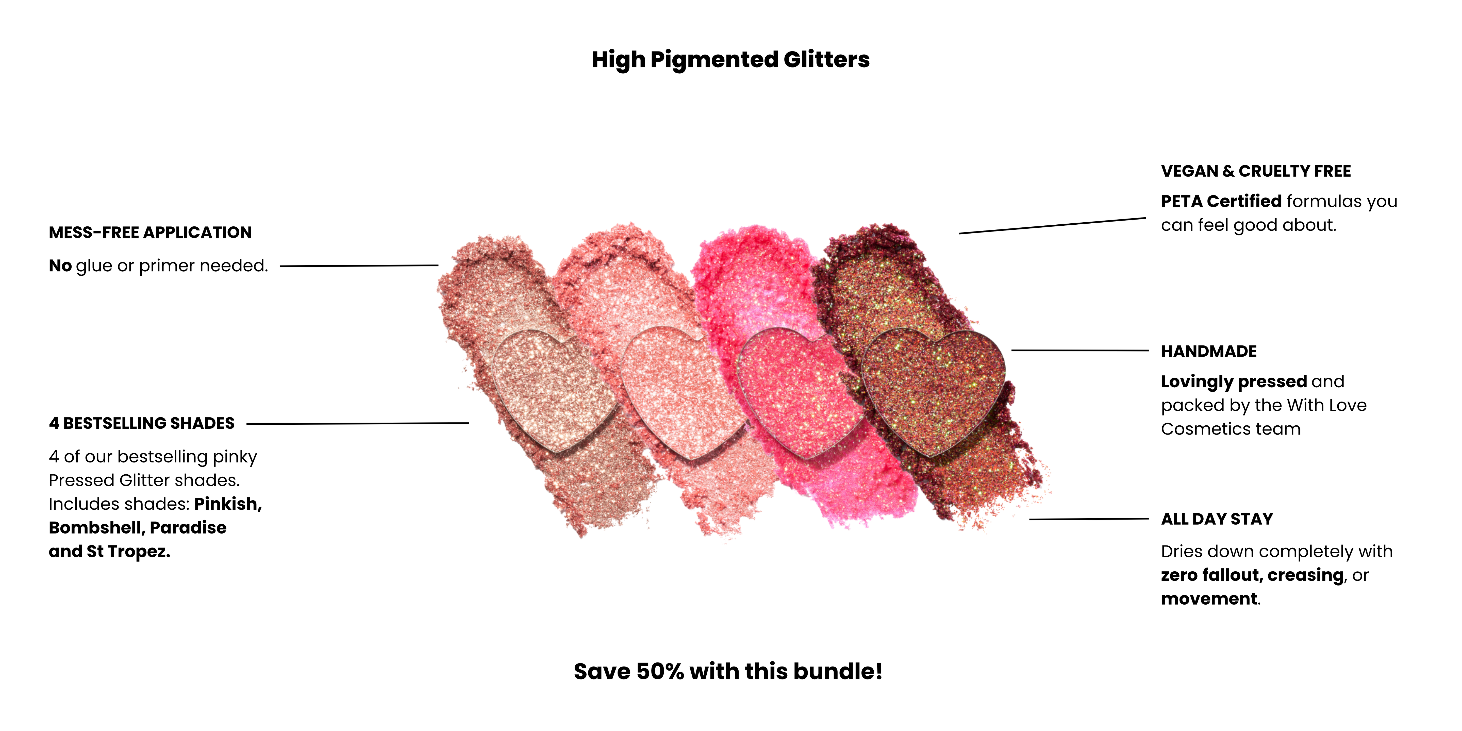 Our Pinks Pressed Glitter Bundle includes 4 of our BEST SELLING pinky Pressed Glitter shades. Includes shades: Pinkish, Bombshell, Paradise and St Tropez.